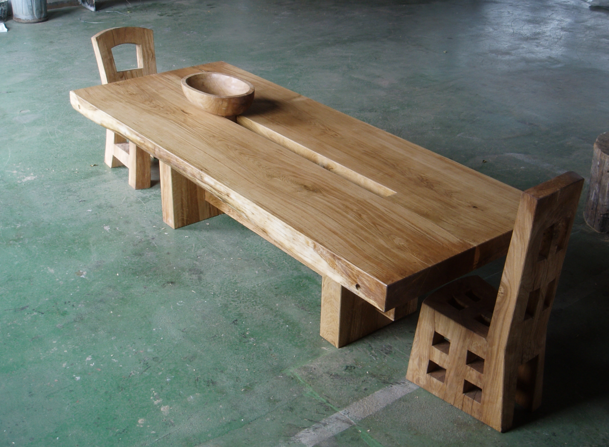 Tento stůl vznikl jako upravená kopie symposiální práce studentů FaVU VUT Brno v sochařském studiu Bubec, kde je možné shlédnout původní originál s prúběžným čepováním. Židle byli vytvořeny podle návrhu Čestmíra Sušky. Po domluvě s autory je možné vytvořit novou kopii stolu.